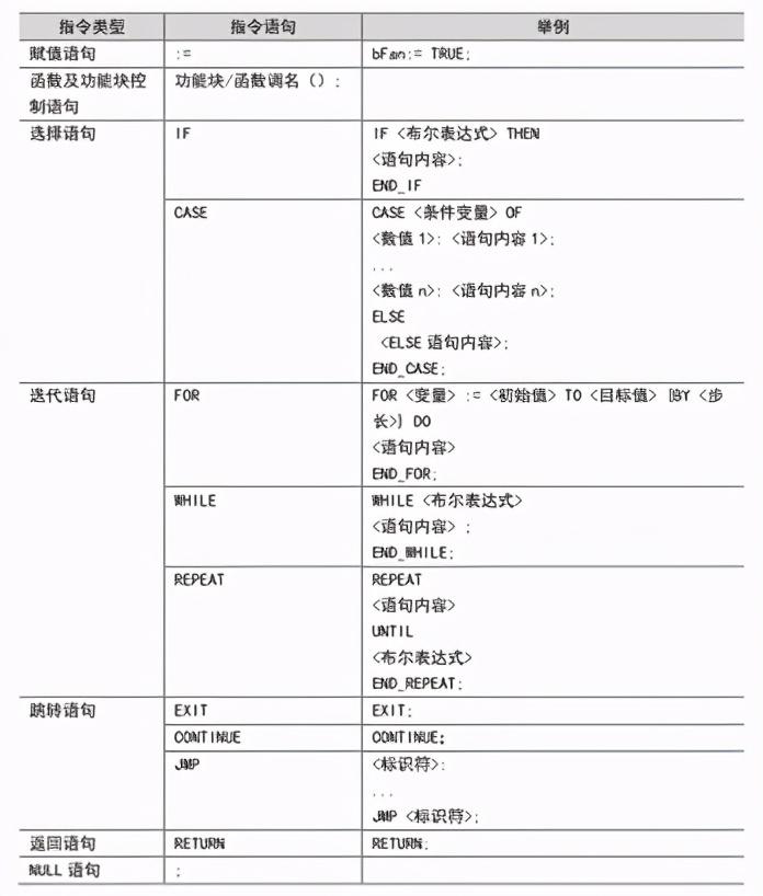 结构化文本语句表主要有 5 种类型,即赋值语句、函数和功能块控制语句、选择语句、迭代(循环)语句、跳转语句。