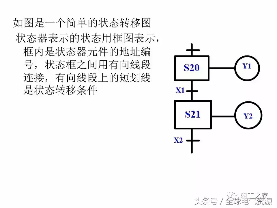 一个控制过程可以分为若干个阶段,这些阶段称为状态。状态与状态之间由转换条件分隔,相邻的状态具有不同的动作,当相邻两状态之间的转换条件得到满足时,相邻状态就实现转换,即上面的动作结束下面的动作开始,描述这一状态转换过程的图就称为状态转移图