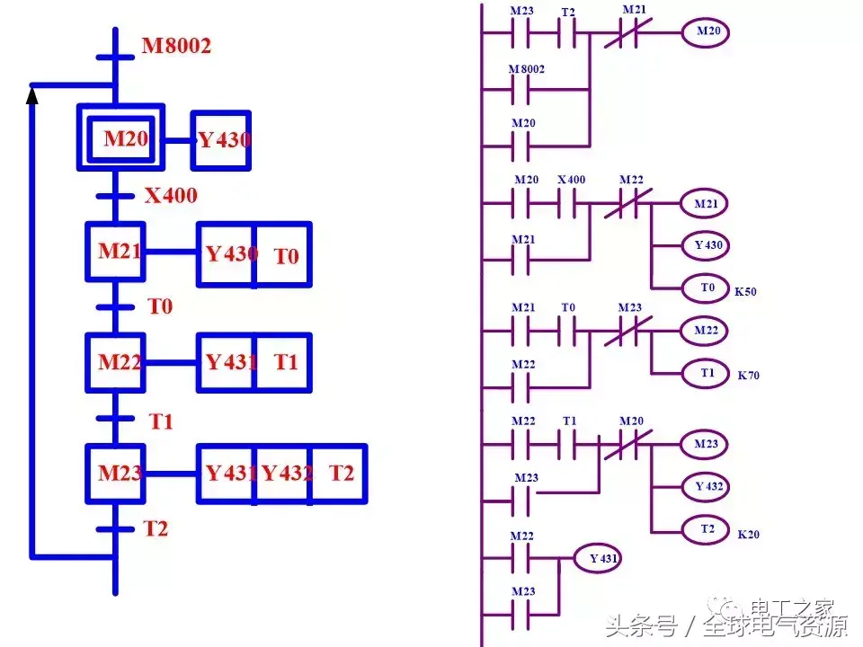 这里我就稍微考考大家好了,有哪位小可爱可以根据这个梯形图画出SFC吗?当然啦,画不出也没关系,因为在编程软件中,本就具有将梯形图转SFC或将SFC转梯形图的功能。