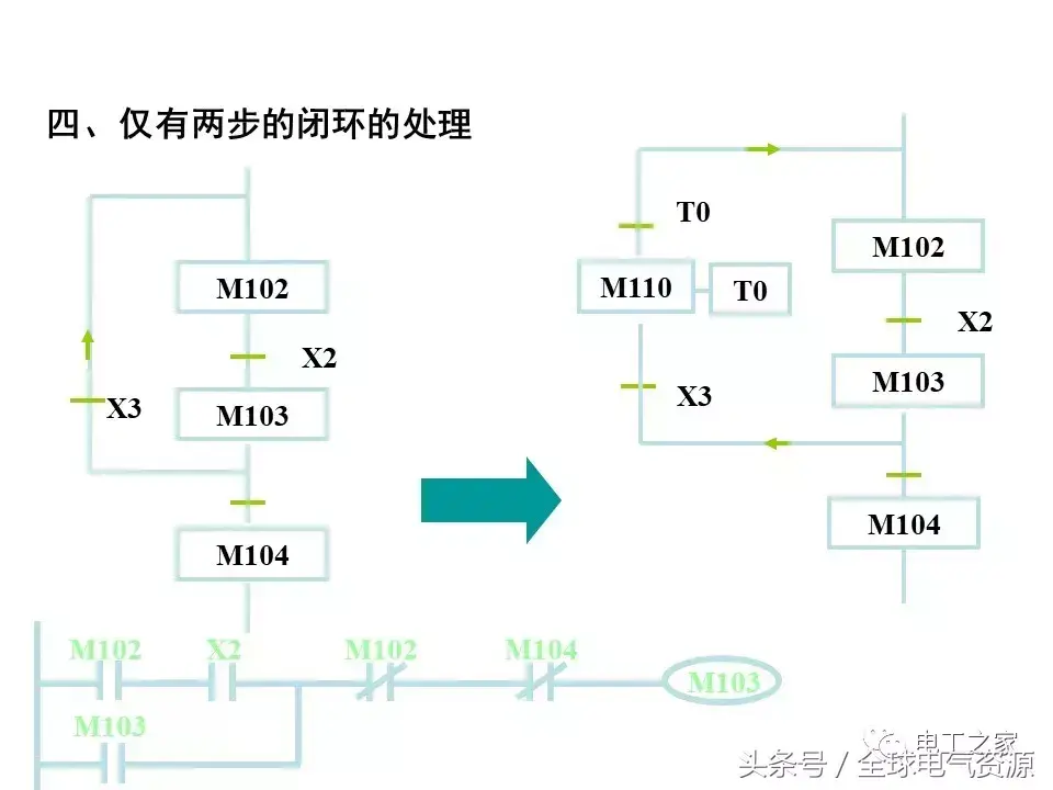 转移条件虽然可以是程序段,但其在SFC图中用短横线表示的部分编写基本是单个触点或几个触点的串并联组合,如下图19-9所示,用于驱动转移指令TRAN。