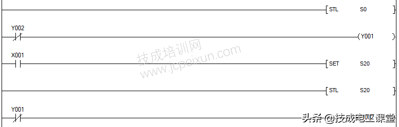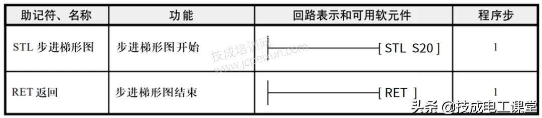 STL指令和RET指令均无驱动条件,STL指令的适用软元件为状态继电器S,如图19-1中的S20,表示S20状态步的开始,有多少个状态步就有多少个STL,而RET指令在一个梯步进形图只出现一次,而且是在步进梯形图的结尾,表示步进梯形图的结束。