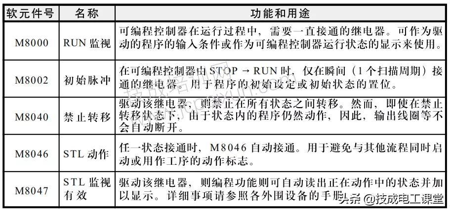 与SFC的梯形图有关的软元件包括状态继电器S和部分特殊辅助继电器M,下图19-4所示为相关状态继电器的编号与功能,这在上一篇文章也有提及。