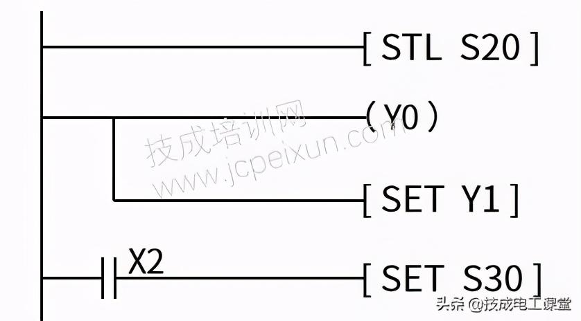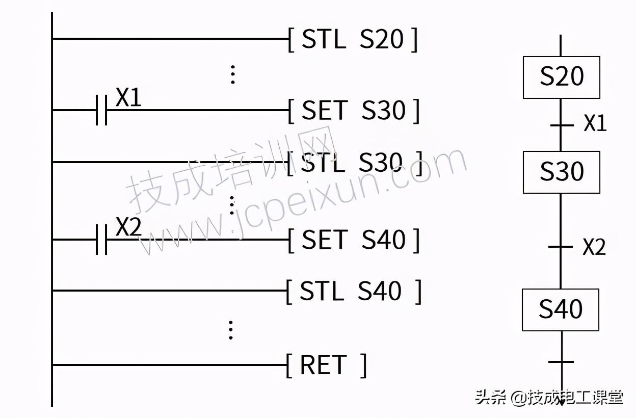 转移条件为X1的接通,转移方向为SET所带的状态继电器编号,如SET S30中的S30。