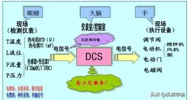 就如下图所示,DCS相当于大脑,对眼睛看到的情况(即现场检测仪表传输过来的信号,如水位降低)做出反应(即发出指令,如增大进水阀开度),现场执行设备接受到指令做出相应的动作(如增大进水阀门开度,保持水位在一定范围)。