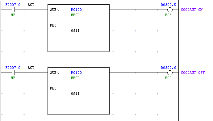 在MDI或自动方式下输入M08,系统会自动使对应F11.0信号为1,当我们在PMC中接收到F11.0为1时,就标示当前的M代码是M08,然后去执行需要的PMC动作。