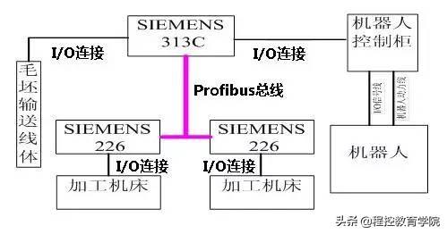 上图PLC采用西门子品牌,S7-300作为上位机,S7-200与机床通过I/O信号相连;S7-300与S7-200使用Profibus总线相连;S7-300与工业机器人使用I/O信号相连;工业机器人主体和控制器之间使用自带通讯电缆(直接接插)连接。