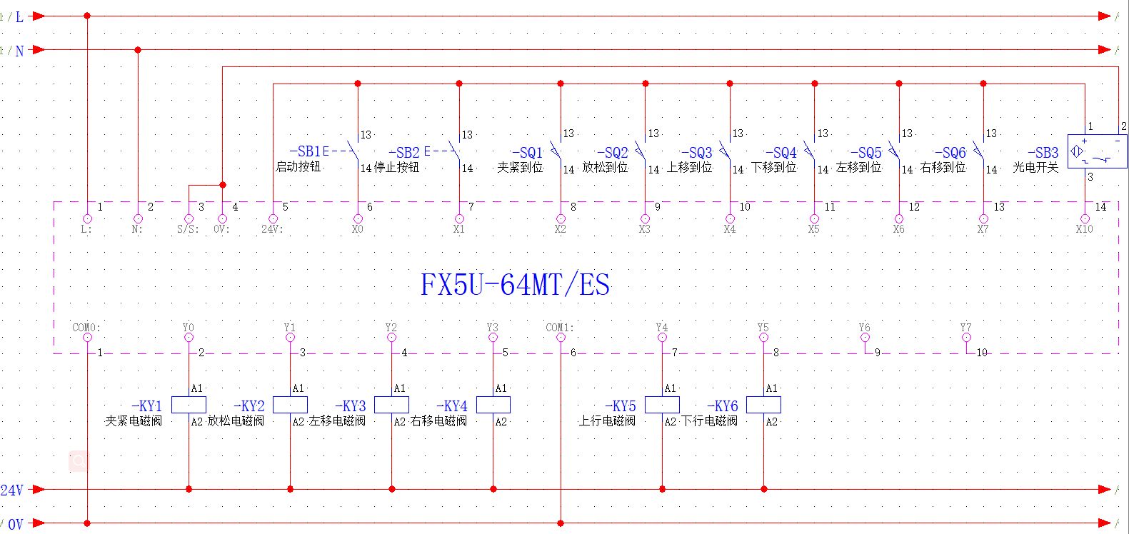 5、机械手工作过程:启动机械手下降到A处位置一夹紧工件一夹住工件上升到顶端一机械手横向移动到右端,进行光电检测一下降到B处位置一机械手放松,把工件放到B处一机械手上升到顶端一机械手横向移动返回到左端原点处。
