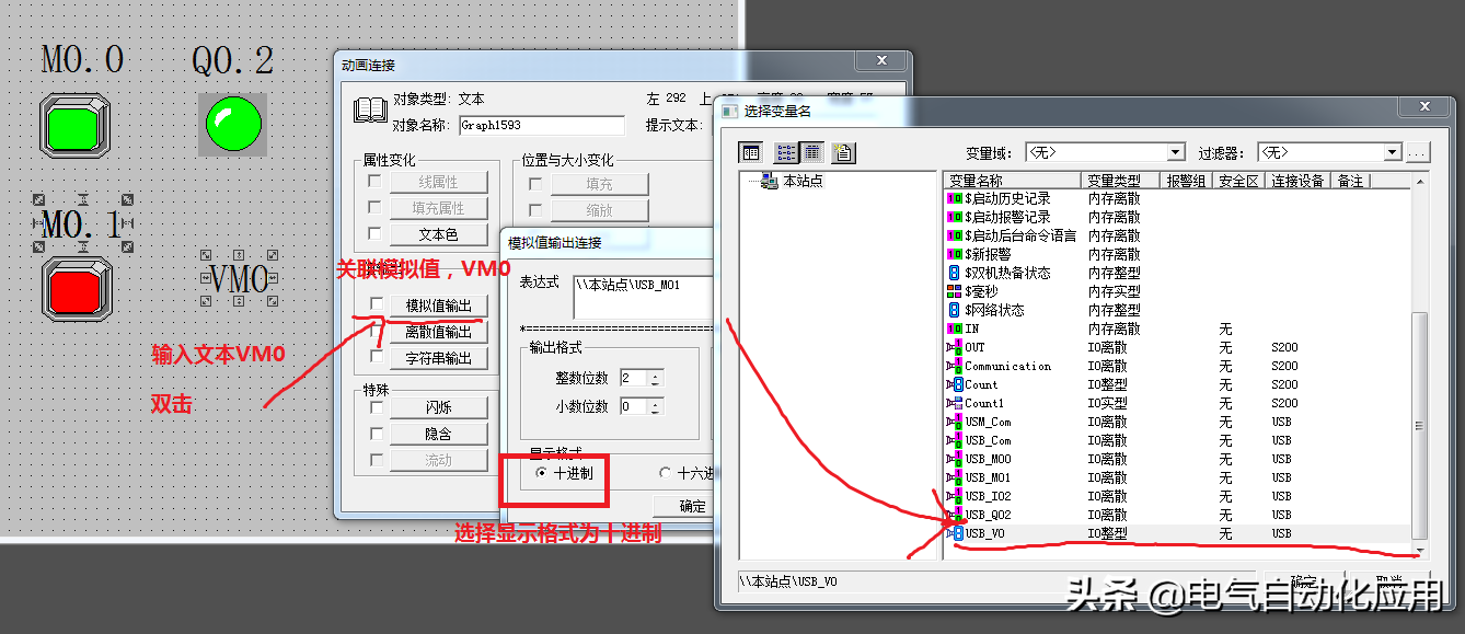 使用同样的方法为按钮M0.1以及指示灯Q0.2建立文本并关联变量。