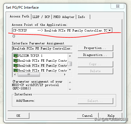 在 Interface Parameter Assignment Used 中点选Realtek PCIe FE Family Controller.TCPIP.1(注意:应根据运行计算机实际工作的网卡名进行选择,务必选择不带Auto 的),然后Access Point of the Application 内显示“CP-TCPIP - Realtek PCIe FE Family Controller.TCPIP.1 即可。