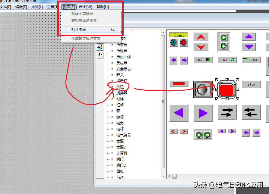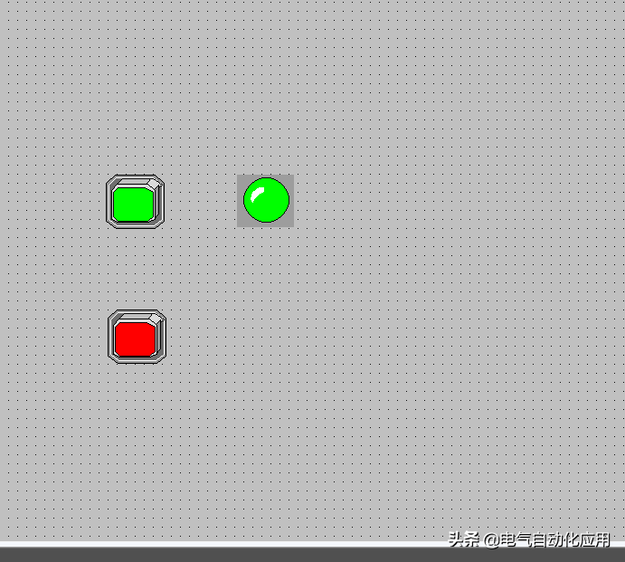 组态好的按钮和指示灯可以通过颜色显示状态之外,还可以通过工具箱的文本用“打开”或者“关闭”的文本标识状态。
