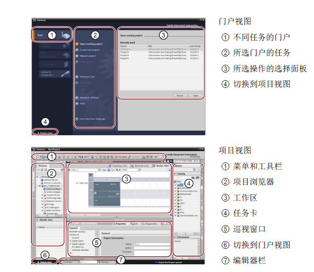 TIA提供了两种不同的项目视图:根据工具功能组织的面向任务的门户集(门户视图),或项目中各元素组成的面向项目的视图(项目视图)。