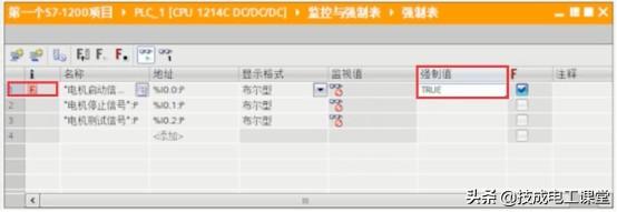 打开强制表之后,添加变量,比如I0.0,然后点击“全部监视”,需要进行变量修改时,我们在“强制值”这一栏中输入需要强制的值,比如TURE,然后点击“启动或替换可见变量的强制”就会把强制值写入到变量中,同时在该变量的行中会标识“F”的图标,PLC上的MAINT指示灯会变为橙色。