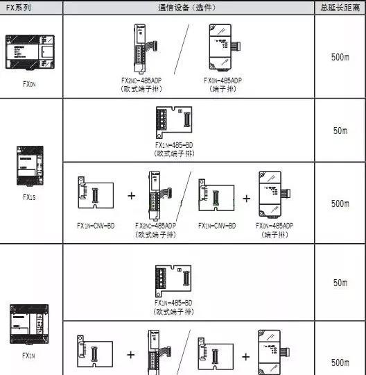 FX0S,FX1系列PLC不能进行并联链接,此外,并联链接还需要专门的通信设备,如:232/422/485通信板,适配器等,下表列出了并联链接的PLC及通信设备的组合使用。