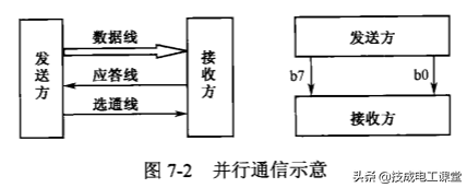 并行数据通信是指以字节为单位的数据传输方式。这种数据传输方式,除了有满足传输数据最大位数的数据线(数据线的根数与数据的位数相等)和一根公共线外,还需要数据通信双方联络的控制线。