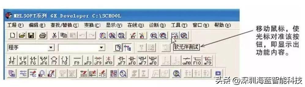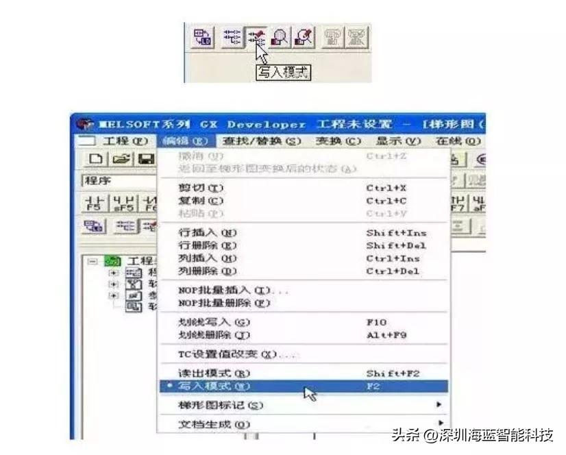 使用功能键或工具按钮编辑梯形图,功能键和梯形图符号关系显示在工具栏的按钮上,编辑梯形图时,必须先设置在“写入模式” 。