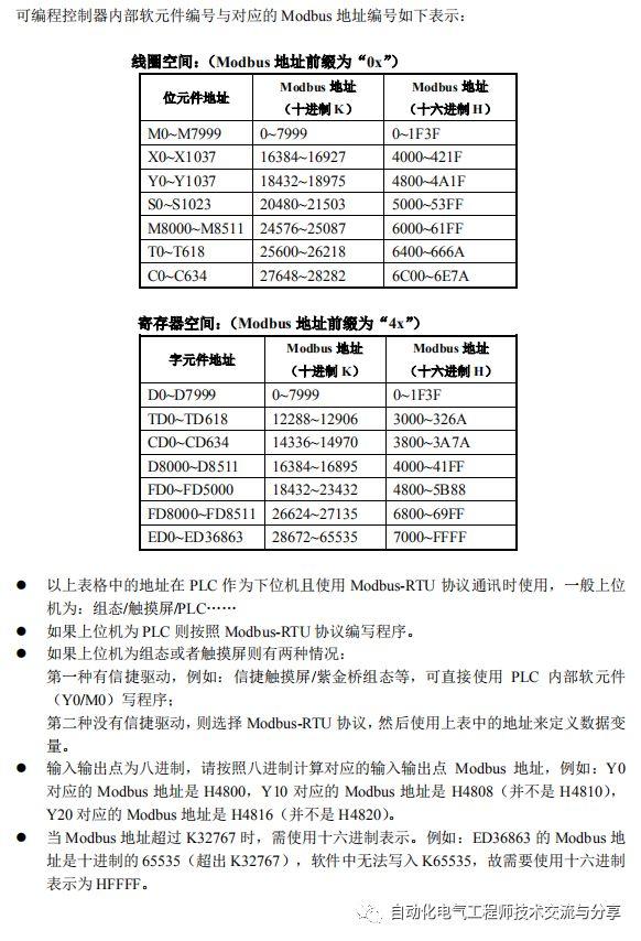 这里需要说明的是,信捷PLC已经集成Modbus协议集,支持Modbus协议通讯主、从机模式,并将其内部的寄存器和Modbus寄存器做了对应,这里我们使用的是其从站模式。可编程控制器内部元件编号与对应的Modbus地址编号如下表示: