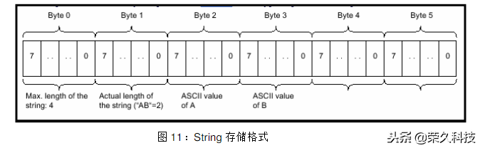 在上面的编程块里需要注意的是,在指定发送缓冲区时。字符的开始地址是从第二个字节,而不是零字节开始,即是P#DB2.DBX2.0 Byte10而不是P#DB2DBX0.0 Byte10,原因是由于S7-1200对字符串的存放的格式造成的,S7-1200对字符串的前两个字节的定义第一字节是最大的字符长度,第二个字节是实际的字符长度。接下来才是存放实际字符。如下图