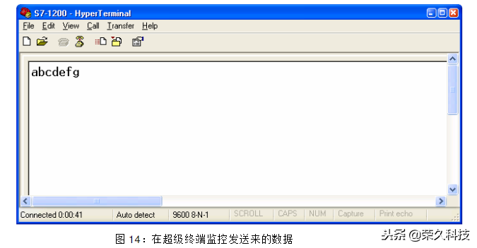 对于第二个功能:超级终端发送数据给S7-1200,实际上是S7-1200是数据的接收方,超级终端是数据的发送方,对于S71200需编写接收程序;而对于超级终揣来说,只要打开超级终端程序,配置硬件接口参数与削面S7-1200的端口参数一致,在界面上输入发送内容即可。