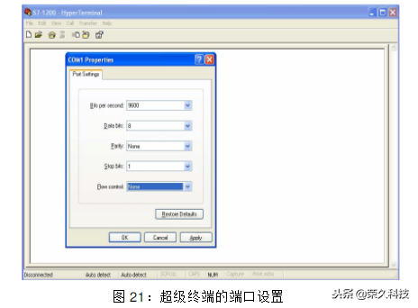 ②、用串口交叉线连接S7-1200的串口与计算机的串口,打开计算机的超级终端程序,并设置硬件端口参数如下图: