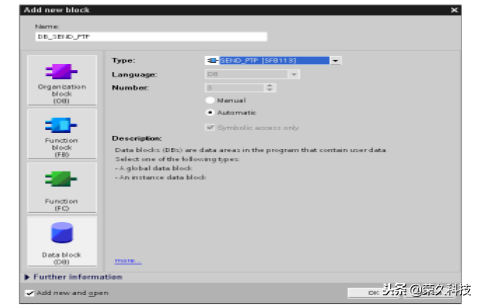要对 SEND -PTP赋值参数,首先需要创建 SEND- PTP的背景数据块和发送缓冲数据块,双击“ Devices”-->“PLC_1”-->“ Program Block”--“ Add new block”,在弹出的串口命名 DB- Send -PTP,选择DB块,在Tyoe后选择“ SEND -PTP(SFB113)”