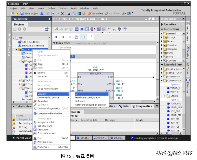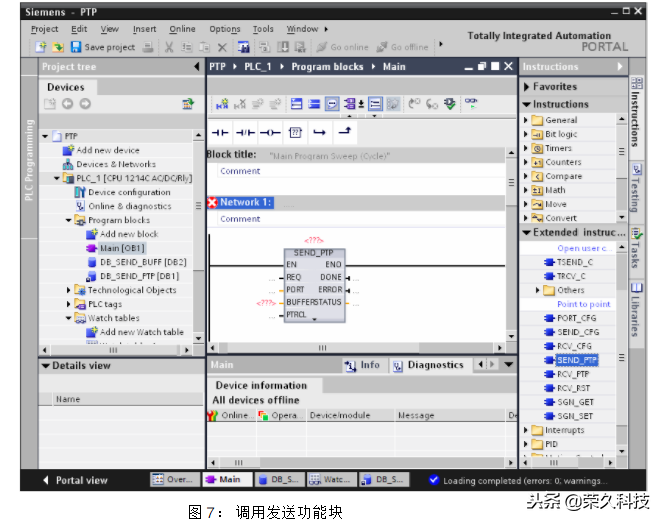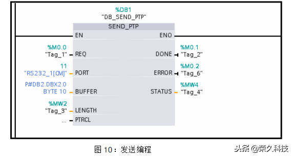 ①、在PLC中编写发送程序,在项目管理视图下双击“Device”下的程序块下的Main(OB1),打开OB1,在主程序中调用 SEND- PTP功能块加下图所示:(注:SEND -PTP在指令库下的扩展指令中通讯指令下)