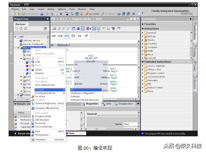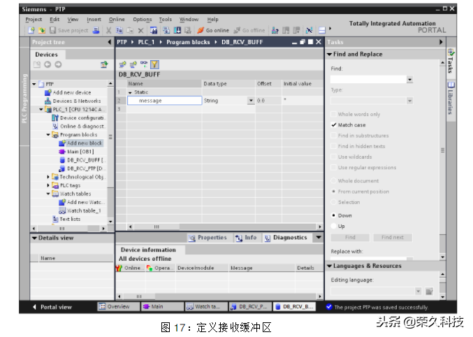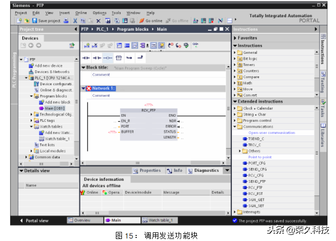 ①、在PLC中编写发送程序在项目置理视国下双击“Device”下的程序块下的Main(OB1),打开OB1,在主程序中调用 RCV - PTP功能块加下图所示:(注: RCV -PTP在指令库下的扩展指令中通讯指令下)