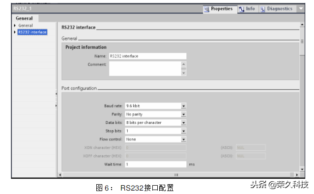 在“ Genera”里括了此模块的“项目信息”和“订货信息”;而在“Rs232 interface“里包括了此模块“项目信息”、“端口的距置”、“发送信息的配置”、“接收信息的配置”和“硬件识别号”,在这里我们选择“RS232”,在“端口”配置的选项里,进行端口的参数配置,