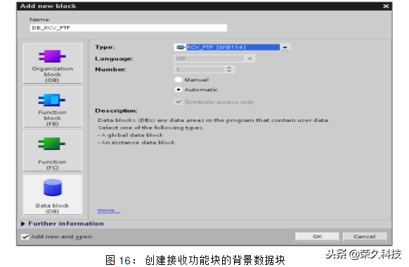 要对 RCV -PTP赋值参数,首先需要创建 RGV - PTP的背景数据模块和发送缓冲数据块,双击“ Devices”-->“ PLC1”-->“ Program Block”“ Add new bloc”,在弹出的率口命名 DB -RCV -PTP,选DB块,在Type后选择“ RCV - PTP(SFB114)”