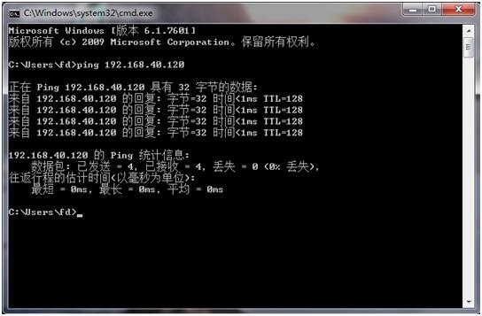 在PLC和电脑之间接入以太网通讯电缆,测试电脑与PLC之间物理连接是否正常。选择操作系统左下角"开始"菜单,在最下一行运行栏中输入"CMD"命令,然后敲回车进入DOS命令界面。在界面中输入ping命令,格式:ping <PLC IP地址> 回车。如果物理连接正常如图6. 所示;如果显示超时或者硬件故障,请检查IP地址设置、网卡驱动以及物理网线。