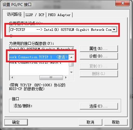 返回"设置 PG/PC 接口"界面,"应用程序访问点"选择"CP-TCPIP","为使用的接口分配参数"选择普通以太网卡的TCPIP协议,如图9.所示,完成后点击"确定"退出。