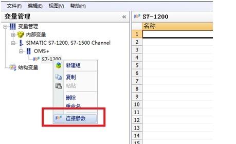 鼠标右键"SIMATIC S7-1200, S7-1500 Channel"驱动下"OMS+"选项,选择"新建连接"新建与S7-1200 PLC的连接。右键选择连接名称,选择"连接参数",如图10.所示。