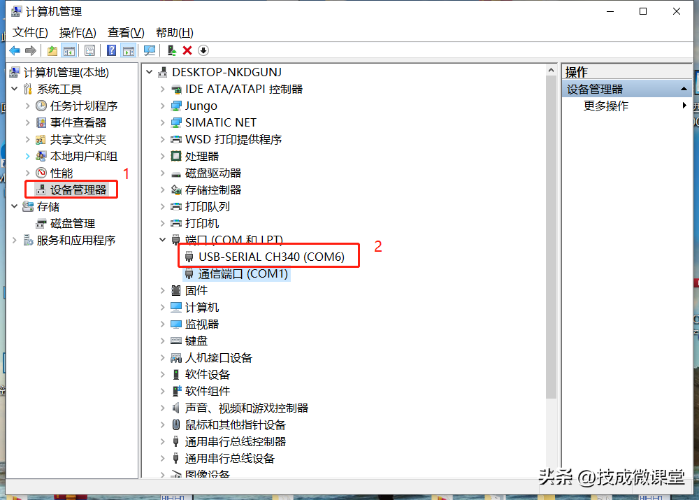国产艾莫讯USB-PPI通讯线需要安装驱动,通讯线驱动可以去艾莫讯官网下载,选择CH340驱动。下载好后打开解压包如图1所示,双击运行,然后点安装。安装完通讯线驱动以后把国产艾莫讯USB-PPI通讯线插到电脑中,桌面电脑图标右键—选择‘管理’—设备管理器,可以看到生成的COM口,如图2所示。