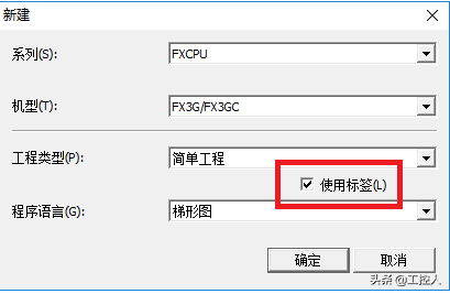 在新建中工程类型选择为简单工程,编程语言是梯形图, 同时在简单工程的右下方的“使用标签”进行打钩。