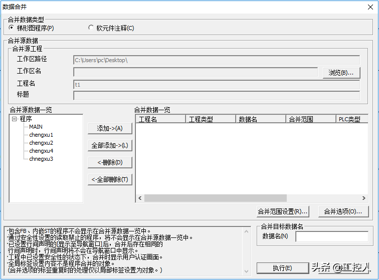 我们可以为每个分段程序命名,注意不能向结构化编程使用汉字进行命名,只能用数字和字母来命名。这样我们就能在每个分段程序中编程程序了,方便我们分类和查找。我们可以像原来一样不使用标签进行编程,在编译时它会提示你没有使用标签,没关系。编辑完成后我们也可以把数据进行合并,就是把每个分段程序合到一个程序里面。