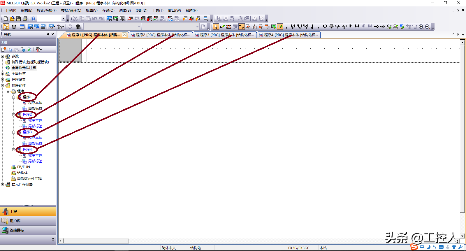 三菱的PLC编程分为简单工程和结构化工程,在结构化工程中可以分段处理程序,可以为每一段的程序命名,在编辑的时候能在不同的页面进行,如下图: