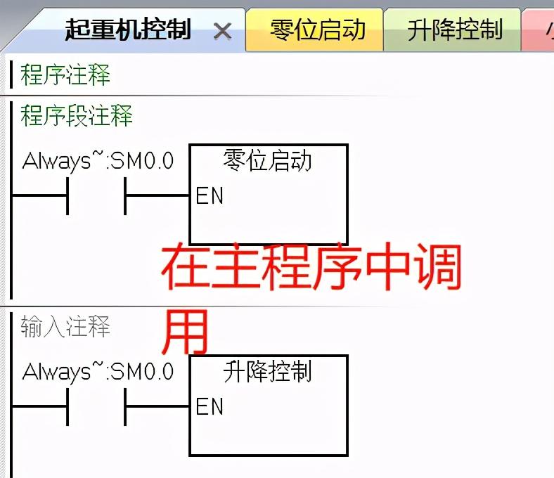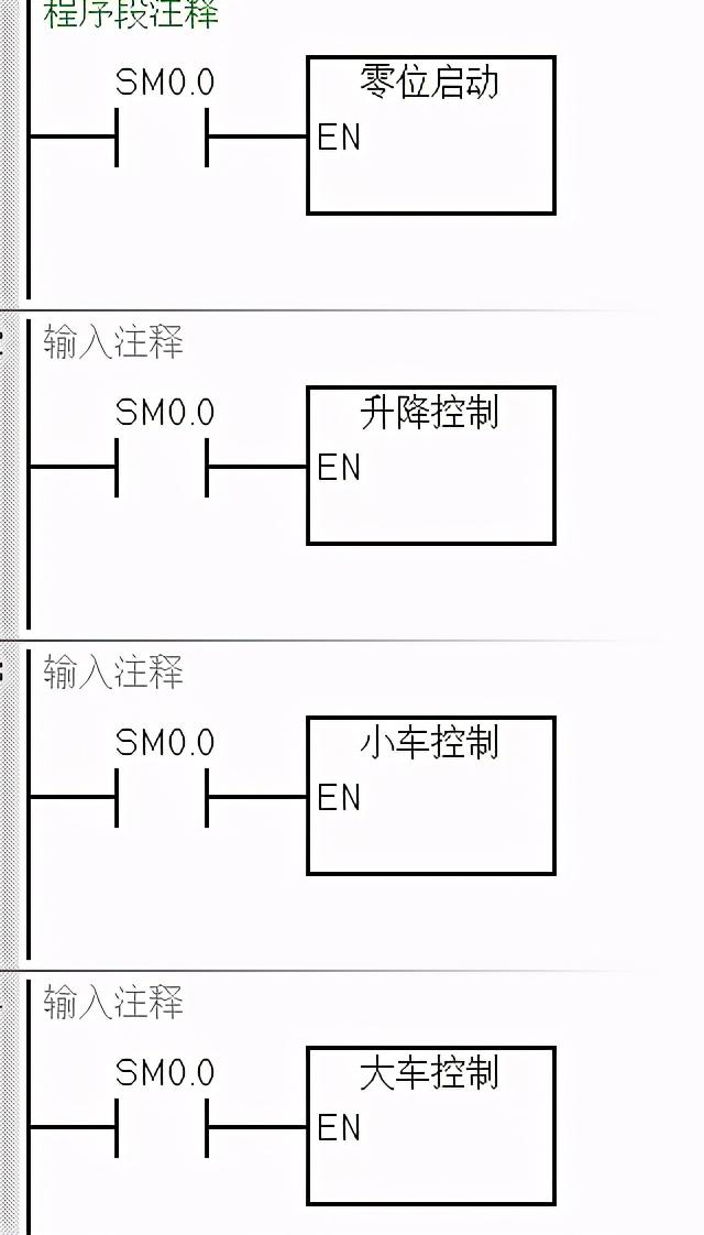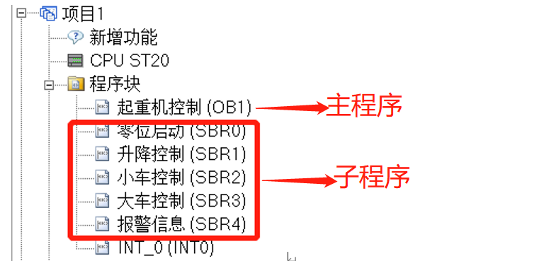 以起重机控制为例可以把程序划分成5个功能块,每个功能块编写一个子程序