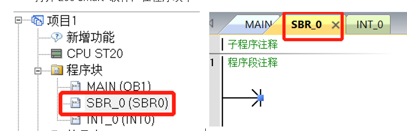子程序建立:打开200 Smart 软件,在左侧项目1中----程序块中SBR_0(SBR0)----就是子程序名称,根据需要可以重新命名,也可以增加子程序数量 如下图