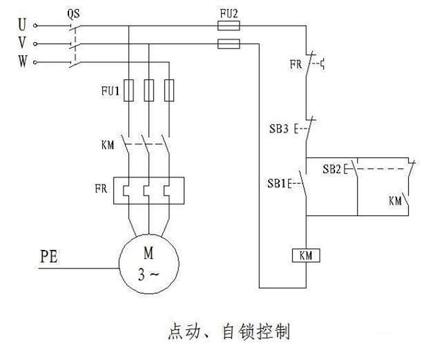 SB1是启动按钮SB3是停止按钮,SB2是点动按钮,按下SB1交流接触器自锁,按下SB3接触器线圈失电。按下SB2交流接线器线圈得电吸合,同时SB2的常闭点断开,切断自锁线,松开SB2接触器线圈失电。因为SB2常开常闭有时间差,所以这种接法效果不太好。