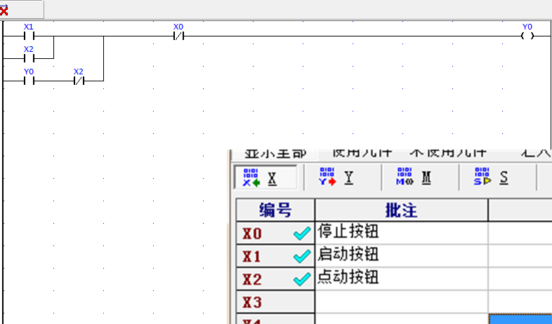 X1闭合YO线圈得电自锁,X0对应停止按钮,当X2闭合时,Y0线圈得电,同时X2的常闭点断开切断自锁线,所以X2对应点动按钮。