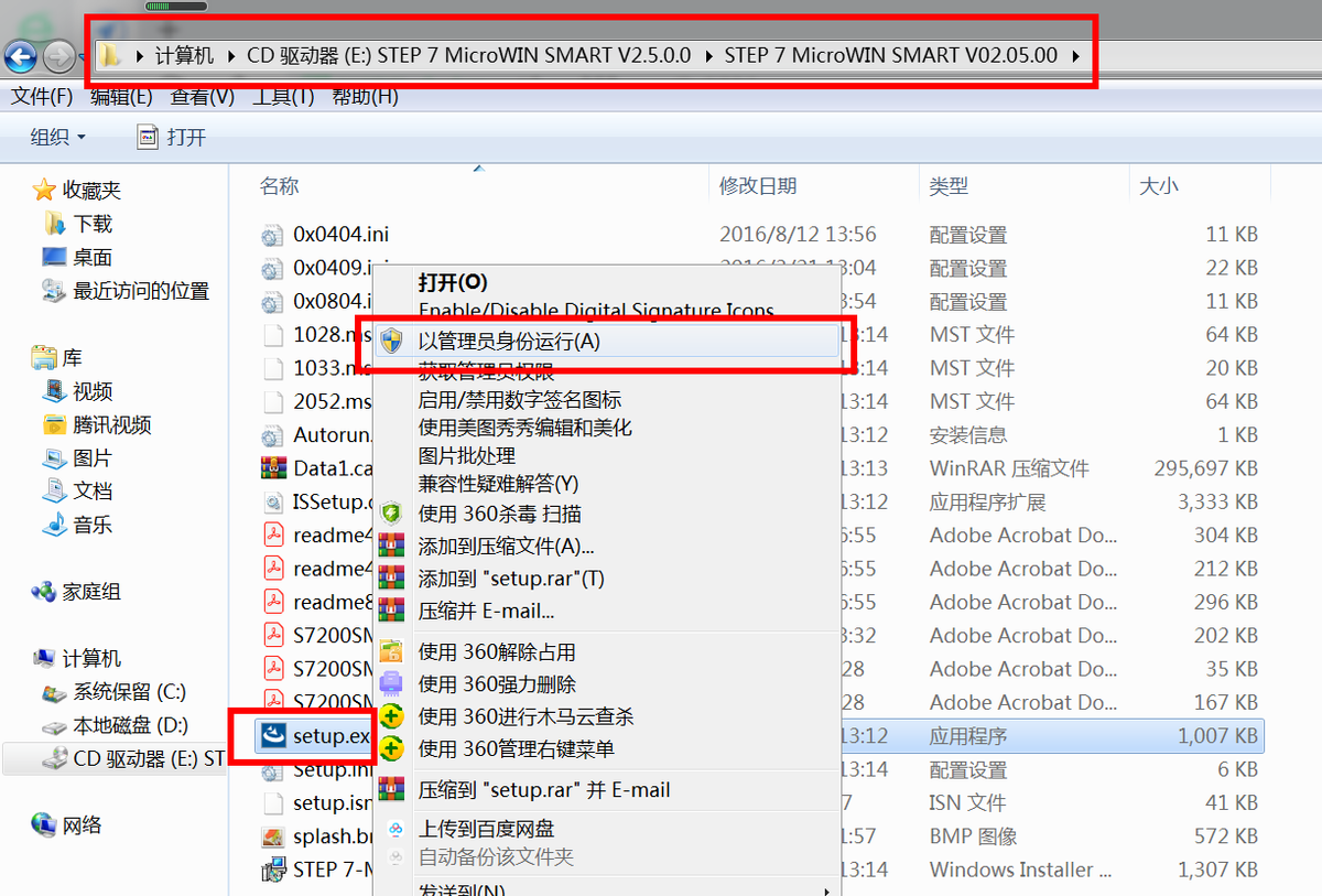 4.退出杀毒软件及安全卫士及各种应用软件,在E:\STEP 7 MicroWIN SMART V02.05.00路径中找到可执行文件setup.exe文件,右键以管理员身份运行该文件。