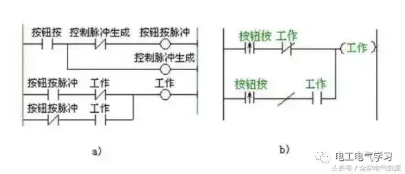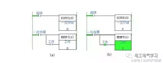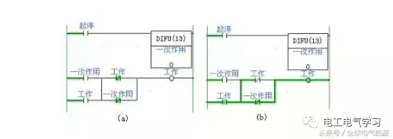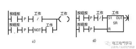 下图所示程序也具有同样的功能。只是这里用的是触点先并后串。脉冲信号用微分指令生成。