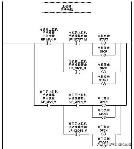 其中(L)为置位指令,(U)为复位指令。这里之所以用置位、复位指令,主要是考虑到启动(打开)条件和停止(关闭)条件可能是脉冲型的(例如上升沿脉冲),需要保持(注:如果MCC中的控制回路使用了“启动-保持-停止”方式,那么采用脉冲输出比较合适,就像自复位式按钮一样。这里为了简化梯形图程序,没有这样做。有兴趣的读者不妨一试)。电机启动或停止条件是自动控制时的联锁条件,上位机进行手动操作时,自动控制程序不能执行。同样就地操作时,PLC的程序控制也不能执行,程序可以根据需要将此时的电机启动和停止控制信号复位。阀门的控制也是一样。这样各个设备均可根据情况进行自动运行或手动操作。