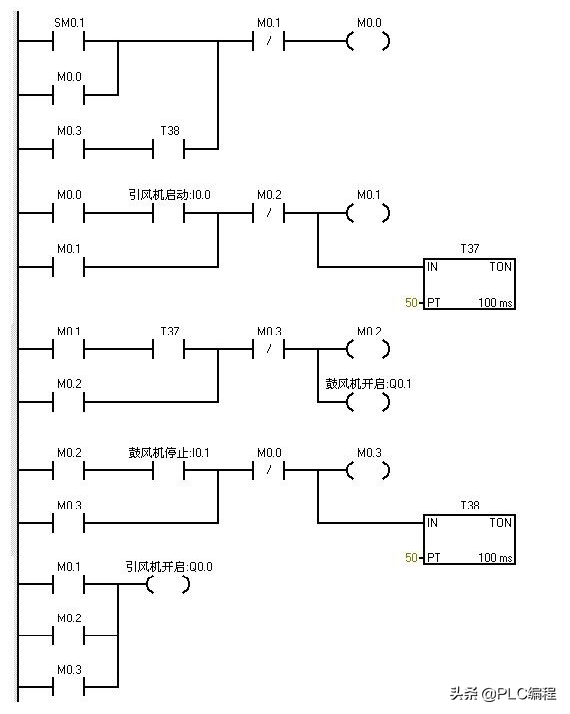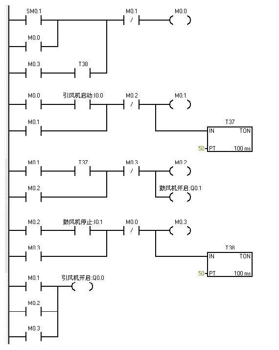 Sm0.1的特点在扫描的第一个周期接通,以后不接通。当按下在线控制面板上的i0.0f时即 i0.0接通,此时Q0.0接通输出,(即指示灯Q0.0亮)引风机启动,同时定时器T37接通并开始计时,当定时器计数到50即(即指示灯Q0.1亮)鼓风机启动。此时两台风机都运行。当按下在线控制面板上的I0.1f时,即接通I0.1此时鼓风机停止运行,(即指示灯Q0.1灭)同时定时器T38接通并开始计时,定时5s后引风机停止运行。(即指示灯Q0.0灭)。