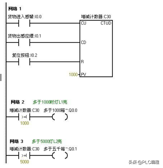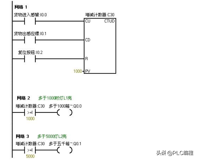 五、比较指令对进出仓库的货物进行记录。仓库最多可放6000箱货物,货物多于1000箱灯L1亮,多于 5000箱时灯L2亮。