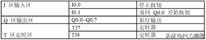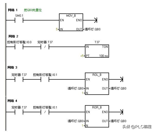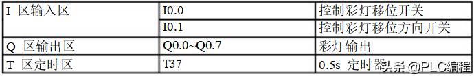 用IO导线控制接在Q0.0到Q0.7上的八个彩灯循环移位,用t37定时,每0.5S移位一位,首次扫描时给Q0.0到Q0.7置初值,让Q0.0和Q0.2先有输出。用I0.1来控制彩灯位移的方向。