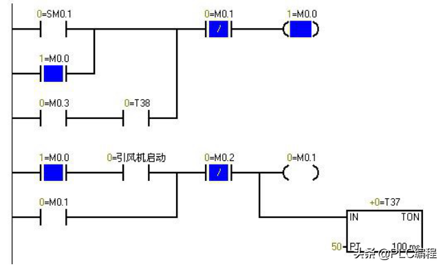 ▲PLC上电时的程序监控图,蓝色表示接通