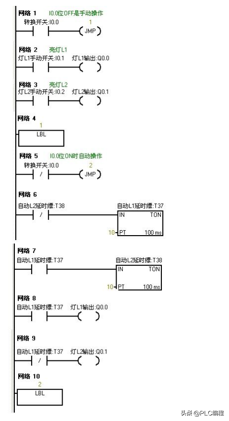 利用跳转指令控制两个灯L1和L2,分别接于Q0.0和Q0.1,切换开关位I0.0,两个灯的控制开关位I0.1和 I0.2.。手动时分别用两个灯的控制开关来控制。自动时,两个灯每隔一秒交替亮。