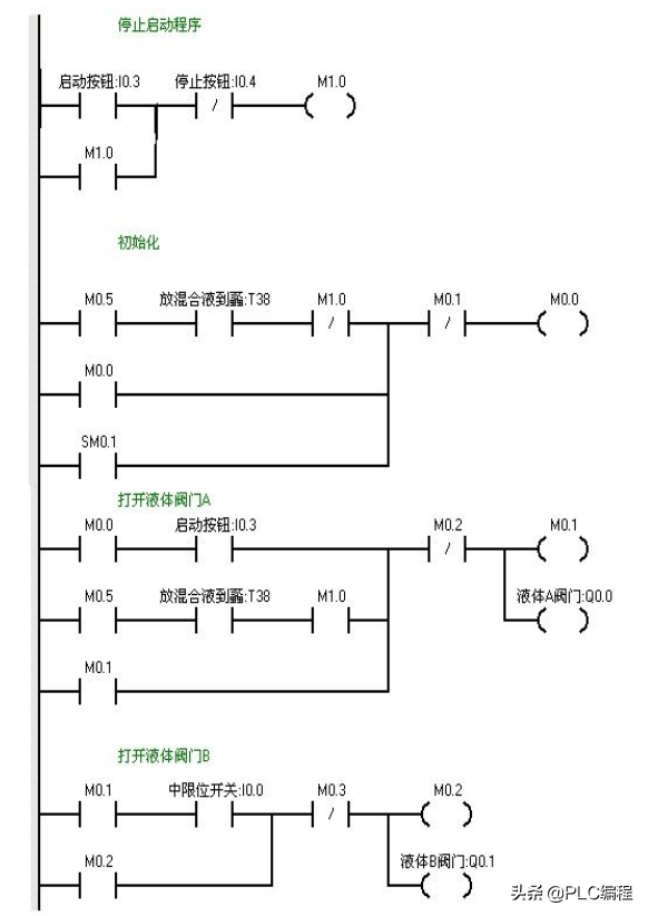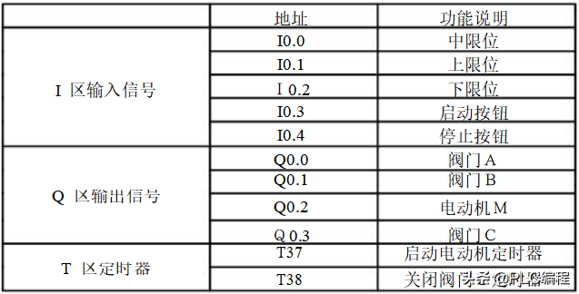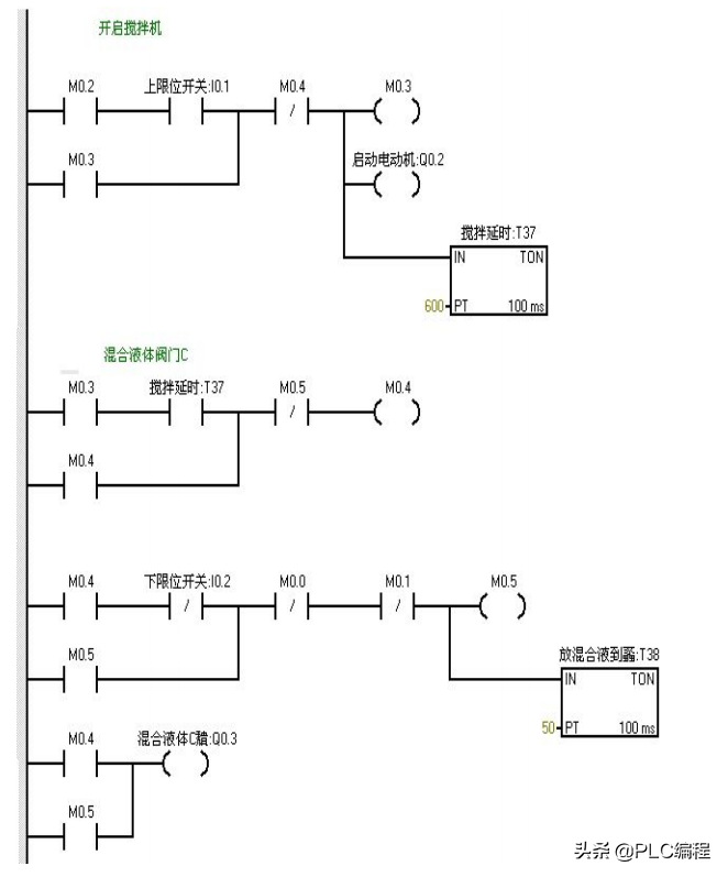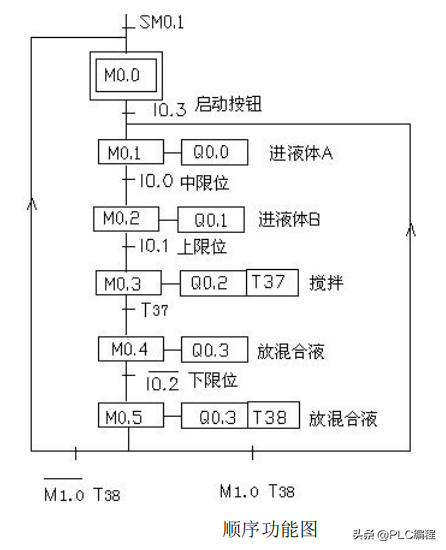 当按下在线控制面板上的I0.03f 即(I0.3闭合)阀A打开(即Q0.0亮),当按下在线控制面板上I0.0f(即I0.0中限位闭合)阀A关闭,阀B打开(即Q0.0灭,Q0.1 亮)当按下在线控制面板上I0.1f(即上限位I0.1闭合)此时阀B关闭,电动机启动开始进行搅拌,(即Q0.1灭,Q0.2亮)同时定时器T37开始定时一分钟,一分钟后搅拌机停止搅拌,阀C打开(即Q0.2灭,Q0.3亮)当液位到达下限位后阀C继续打开(即Q0.3亮)同时定时器T38开始定时。5s后阀C关闭。阀A打开,(即Q0.3灭,Q0.0亮),进入下一个循环周期。按下在线控制面板上的I0.4f(即表示停止的I0.4闭合)此时系统不会立即停止,而是当运行完一个周期后才停止。