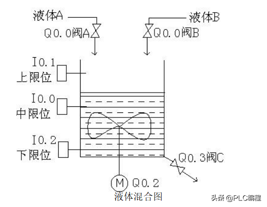 用S7-200实现液体混合的自动控制。当按下启动按钮后,液体阀A 打开,液体A流入搅拌机里面。当液位达到中限位时阀A关闭,同时打开液体阀B,液体B流入搅拌机里面。当液位达到上限位时,阀B关闭,此时启动电动机进行搅拌。搅拌一分钟后电动机停止同时阀门C打开,混合液体流出。当液位到达下限位时再过5S容器放空,关闭阀门C。同时打开阀门A,注入液体A。如此周期性的循环。若按下停止按钮后必须要等一个周期循环完后才停止。