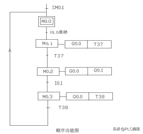 PLC一上电后sm0.0一直保持接通。所以t37进行延时计时,延时到后启动t38计时,t38计时到后t38常闭触点断开所以t37断开计时,t37常开触点恢复为常开所以t38也断开计时。此时t38的常闭触点恢复为常闭所以t37又重新计时,同时计数器C0开始计数一次。如此的反复计数。当计数为1时,Q0.0接通。计数器计数为2时Q0.1接通……如此下去当计数器计数到8时Q0.7接通。当计数器计到9时计数器C0清零。当按下在线控制面板上的I0.0f(即I0.0)接通,此时计数器,和Q0.0~Q0.7都清零,即没有一个灯亮。当按下在线控制面板上的I0.1f(即I0.1接通)此时计数器开始重新计数,灯又从Q0.0开始重新一个接一个的往下亮。